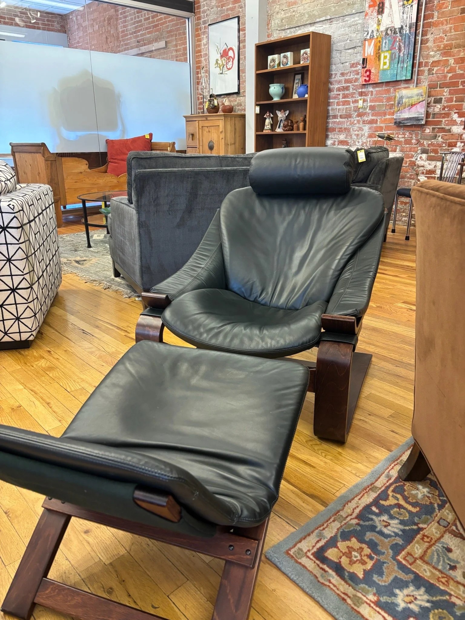 1970 Swedish design Kroken dark leather lounge chair from Roche Borbois with matching ottoman