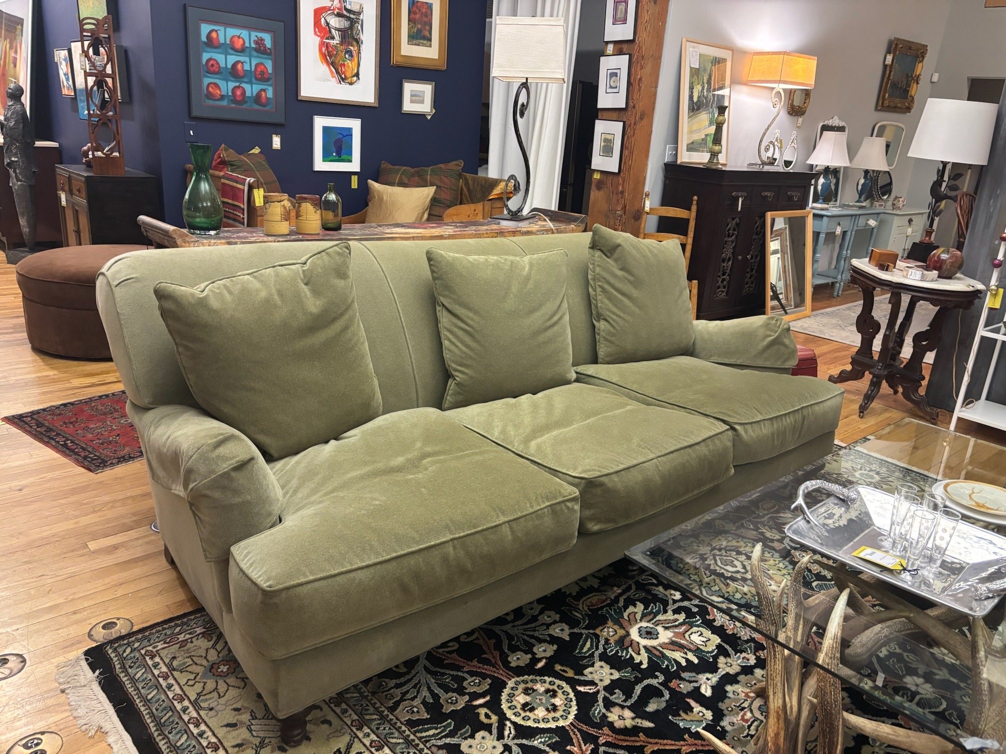 7' Restoration Hardware green velvet english classic roll arm sofa